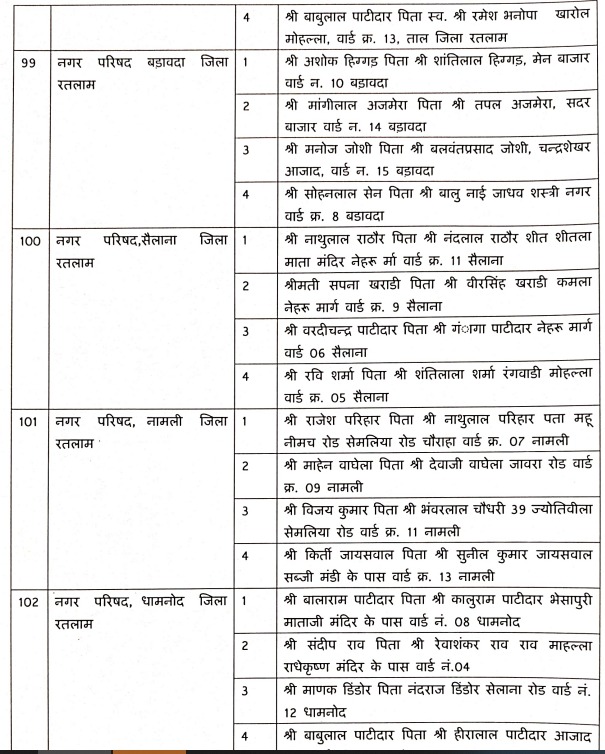 - नगर परिषद बदनावर: मितेश शर्मा, भूपेंद्र सिंह राठौड़, कपिल नहर, कन्हैयालाल गुर्जर