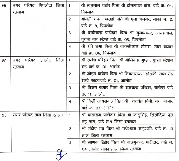 - नगर परिषद चंद्रशेखर आजाद नगर: धर्मेंद्र जायसवाल, दीपक राठौर, विजय जैन, सोनल प्रजापत