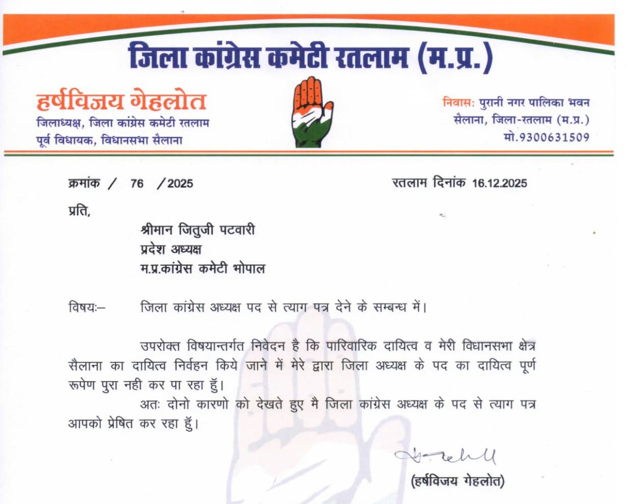 रतलाम के जिला कांग्रेस अध्यक्ष ने दिया इस्तीफा